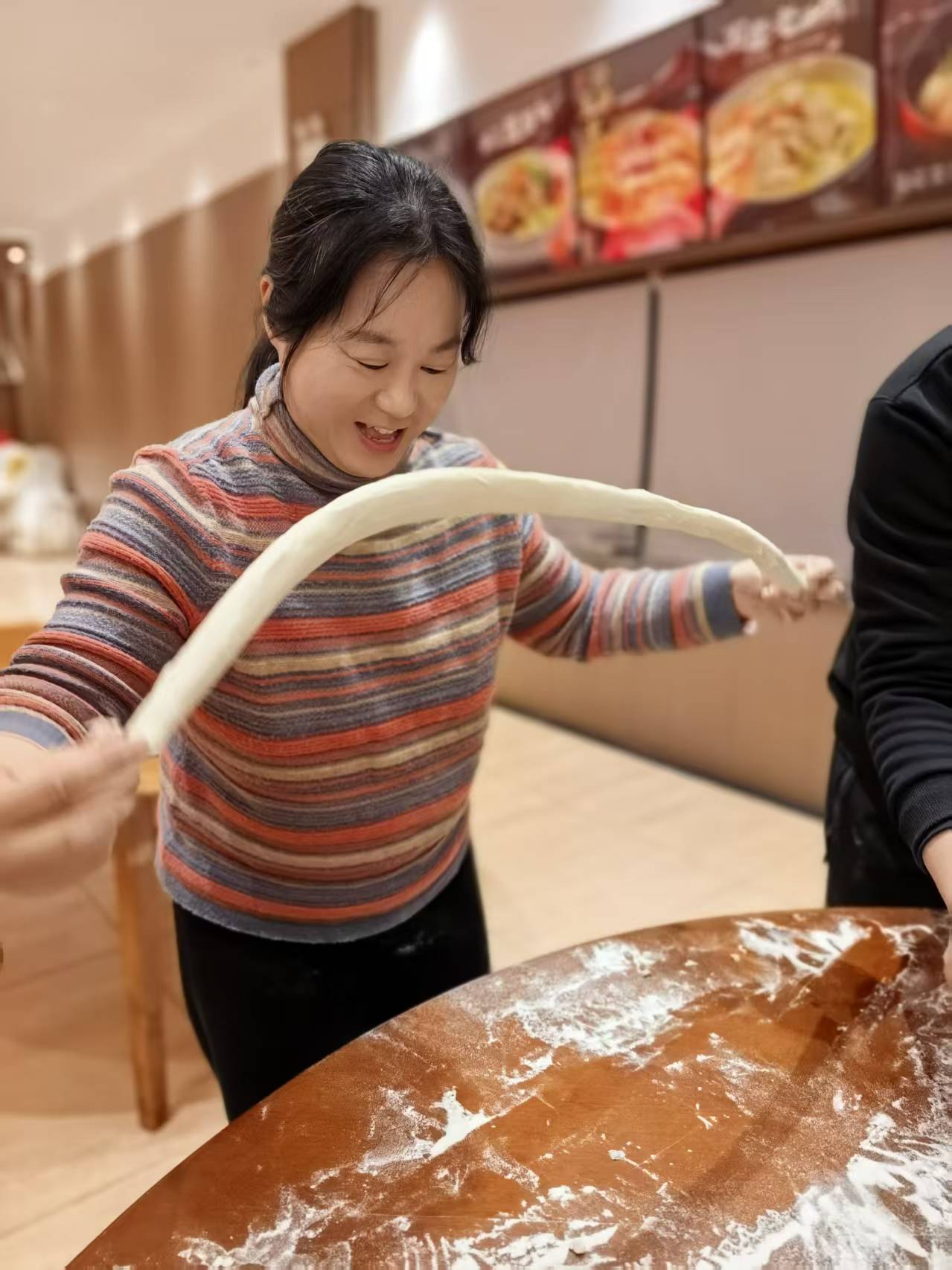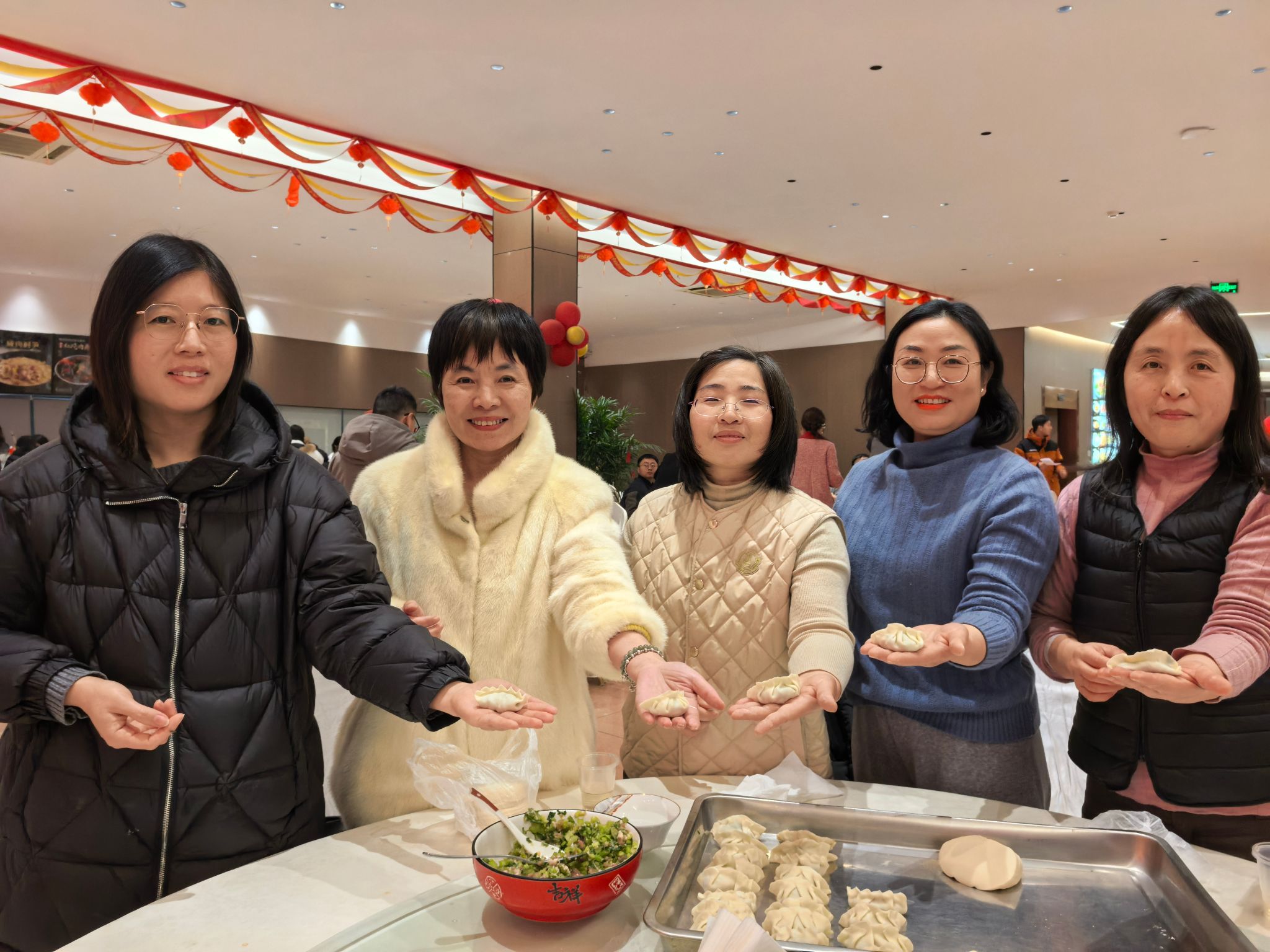 活动现场年味浓郁、暖意融融。活动设置了多个特色体验区,气氛热闹温馨。在“新春送福”区,老师们挥毫泼墨,一幅幅红火喜庆的“福”字寄托着对新年的美好祝愿;“特色美食”区内,冰糖葫芦、现制烧烤等吸引了不少老师亲手制作;“化材团圆饺”包饺子活动更是温馨满满,大家分工协作,擀皮、包馅、捏合,动作娴熟,面团在擀面杖下翻飞成圆薄的面皮,馅料在指尖巧妙组合成饱满的水饺,欢声笑语中,桌上便摆满了一盘盘形态饱满的饺子。