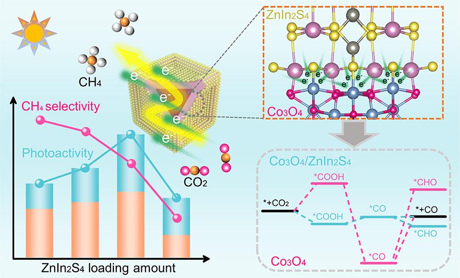 鉴于此,胡勇课题组通过热处理-溶剂热反应两步法制备了Co3O4/ZnIn2S4异质纳米立方体用于高效的CO2光还原。研究发现,还原产物主要为C1化合物(CO和CH4),C1产物生成速率随ZnIn2S4的负载量增加显示出火山型演变规律,最高达51.1 μmol g−1h−1。有趣的是,对Co3O4/ZnIn2S4异质结而言,CH4选择性随ZnIn2S4的负载量增加单调地降低。基于原位漫反射红外光谱分析和密度泛函理论计算,发现界面电子相互作用不仅主导催化活性演变,而且影响产物选择性。与单一的Co3O4相比,界面电子相互作用改变异质结中Co3O4的电子结构,降低CO*反应中间体的加氢能垒,导致异质结相对单一组分显示出更高的CH4选择性。通过改变ZnIn2S4的负载量,调节Co3O4表面的暴露比例,能够有效调控CH4选择性。这项工作首次同时揭示了异质结界面电子相互作用主导的活性和选择性演变机制,为开发高效高选择性CO2光还原催化剂提供新思路。