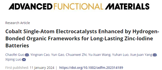 近日,威廉英国化学学科新能源材料与传感器件团队在国际知名期刊《Advanced Functional Materials》(中科院1区Top,IF=19)在线发表题为“Cobalt Single-Atom Electrocatalysts Enhanced by Hydrogen-Bonded Organic Frameworks for Long-Lasting Zinc-Iodine Batteries”(用于长效锌碘电池的氢键有机框架增强的钴单原子电催化剂)的研究论文。本校青年教师郭超飞博士为第一兼通讯作者,化学学科罗锡平教授和杨雪娟老师为通讯作者。williamhill英国为第一单位,合作单位为上海大学,温州大学和香港城市大学。