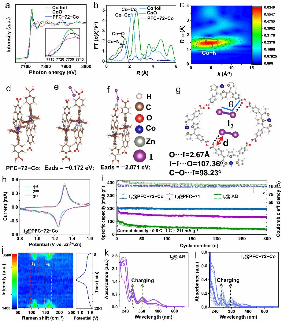 本研究提出了一种氢键钴卟啉框架策略,它可以有效地负载碘,并可作为水性锌碘有机电池的电催化剂。原位傅立叶变换红外光谱(FT-IR)、X射线光电子能谱(XPS)和密度泛函理论(DFT)的研究结果表明,氢键有机框架(HOFs)对碘具有优异的吸附特性。