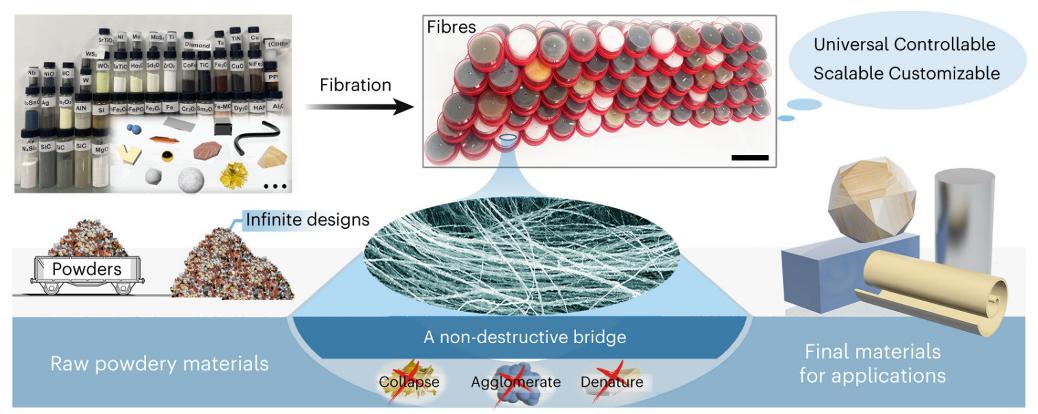 近日,威廉英国生物质仿生智能研究团队在国际期刊《Nature Materials》(IF=41.200)发表题为“Fibration of Powdery Materials”(粉末材料纤维化)的研究论文,开发了粉末材料无损成型技术,为初级粒子和宏观应用之间架起一座通用、强大和非破坏性的微纳纤维桥梁。