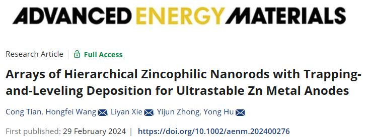 近日,威廉英国胡勇教授等人在国际顶尖期刊《Advanced Energy Materials》(中科院1区Top,IF=27.8)在线发表题为“Arrays ofhierarchicalzincophilicnanorods withtrapping-and-levelingdeposition forultrastable Znmetalanodes”(分层亲锌纳米棒阵列通过先捕获后填平沉积实现超稳定锌负极)的研究论文,证明了由氮掺杂碳包覆Cu5Zn8合金构筑的核壳纳米棒阵列(Cu5Zn8@NC)可以均匀负极界面离子通量并降低局部电流密度,实现超长的镀锌/剥离循环。