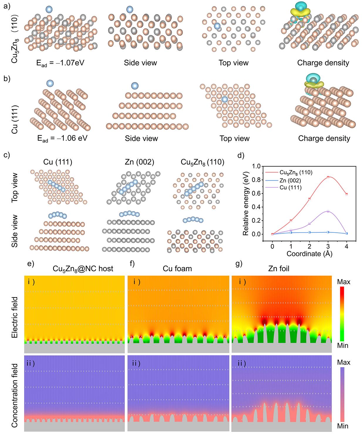 DFT理论计算展示锌原子在Cu5Zn8表面的吸附能为–1.07 eV,说明这种合金组分可以作为亲锌位点进行优先成核,并在电场驱动下促进“自内向外”的镀锌过程。差分电荷密度再次表明锌在Cu5Zn8表面上存在比铜金属更为明显的电荷转移。此外,理论计算模拟了锌分别在Zn (002)、Cu (111)和Cu5Zn8(110)晶面上相邻能量最小值的扩散路径。计算得到的Cu5Zn8扩散能垒为0.84 eV,远高于纯Zn(0.03 eV)和Cu(0.34 eV),证明合金有利于锌离子的沉积固定。有限元模拟结果表明,Cu5Zn8@NC有望均匀局部电场和浓度场分布,促进电极/电解液的充分接触。