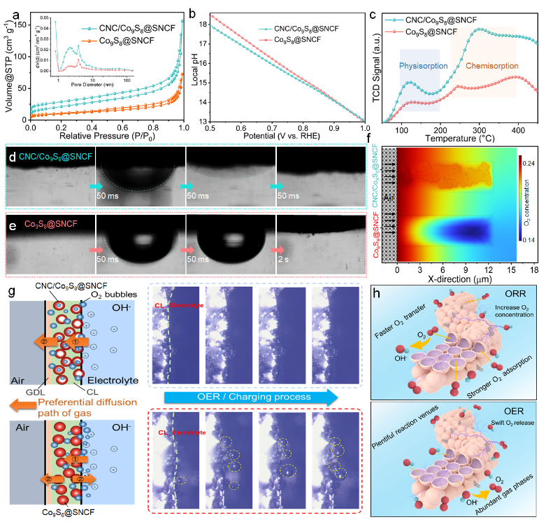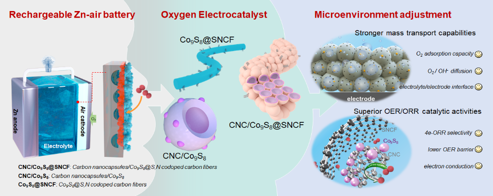 该研究通过设计优化结构制备了一种碳纳米纤维催化剂(CNC/Co9S8@SNCF),该催化剂由中空碳胶囊和Co9S8颗粒组装而成。催化剂内部引入的碳纳米胶囊层发挥了“气体缓冲”的关键作用,而外部的纤维支撑则建立了一个可增强电子传质的三维框架。这种结构上的协同效应有效地调节了活性位点周围的微环境,不仅在ORR和OER过程中促进了气体扩散和离子传质,还有利于氧气吸附/扩散和缓解氧还原反应过程中的局部pH值变化。同时这种独特的纳米结构特点也有能够促进OER反应过程中生成的氧气的释放和界面电子的转移。通过BET分析发现碳纳米胶囊的引入显著增加了催化剂的比表面积,RDE电极周围局部pH变化证实了该结构能够加快OH-的传质过程,从而促进4电子ORR反应的发生。O2-TPD、浮泡角测试以及有限元模拟共同证明该结构能够促进催化剂对氧气的吸附能力。原位光学显微镜证实了该结构在OER过程中可以促进气泡的排出,从而降低充电过程的电位,延长催化循环寿命。随后通过原位Raman表征证明了Co作为主要活性位点参与到ORR反应之中,原位EIS证明了中空胶囊促进反应过程中的离子与气体传质。理论计算进一步证实了碳胶囊结构的存在对于Co位点的电子调控作用,并表现出了更强的氧气吸附能力,以及降低的OER/ORR反应能垒。以此组装的液态锌-空气电池具有较高的功率密度(280 mW cm-2)、比容量(758 mAh g-1)和循环稳定性(1200 h)。柔性准固态锌-空气电池也具有良好的可充电性和广泛的适用性。