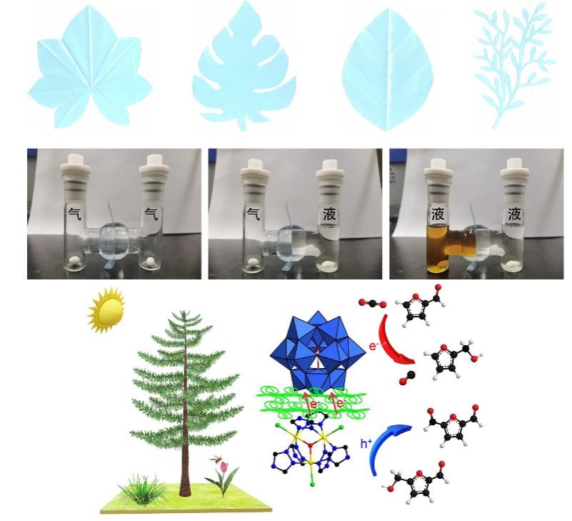 人造树叶能源转化技术的发展符合国家提倡的“既要绿水青山,也要金山银山”未来发展大计。当前人造树叶仅能在光敏剂和牺牲剂共同参与下发生氧化或还原半反应,反应速率缓慢且反应体系复杂,阻碍了人造树叶的应用。为此,团队设计了一种双功能人造树叶并构建了光转化全反应体系,通过充分发挥纤维素定向电子传递作用与多金属氧酸盐电子储存的功能,在光照的条件下,实现了电荷快速分离、电荷储存与生物质能源高效转化。与已报道的人造树叶相比,双功能人造树叶具有以下优势:实现了多相结合(气-液,液-液,气-气)催化反应体系的构建;独立的氧化和还原反应体系增加反应接触频率提高了转化效率(CO2还原:2779 μmol g−1 h−1;糠醛还原:7925 μmol g−1 h−1;羟甲基糠醛氧化:10847 μmol g−1 h−1);使用寿命延长,不受季节和环境的影响。