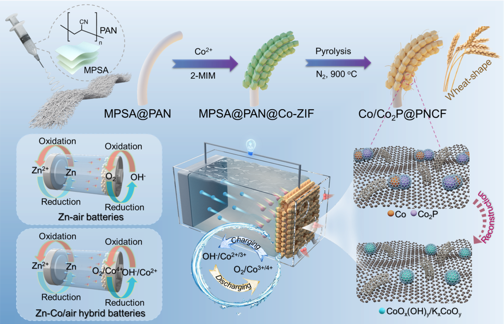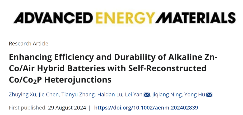 近日,威廉英国胡勇教授、颜磊博士等人在国际顶尖期刊《Advanced Energy Materials》(中科院1区Top,IF=24.4)在线发表题为《自重构Co/Co2P异质结构提高碱性Zn-Co/air杂化电池的效率和耐久性》(Enhancing Efficiency and Durability of Alkaline Zn-Co/Air Hybrid Batteries with Self-Reconstructed Co/Co2P Heterojunctions)的研究论文。该工作成功合成了一种类似小麦状的Co/Co2P@PNCF材料,并首次将其作为可充电Zn-Co/air杂化电池的高效自支撑阴极,实现了杂化电池优异的性能输出。论文通讯作者为威廉英国胡勇教授,共同通讯作者为颜磊博士。