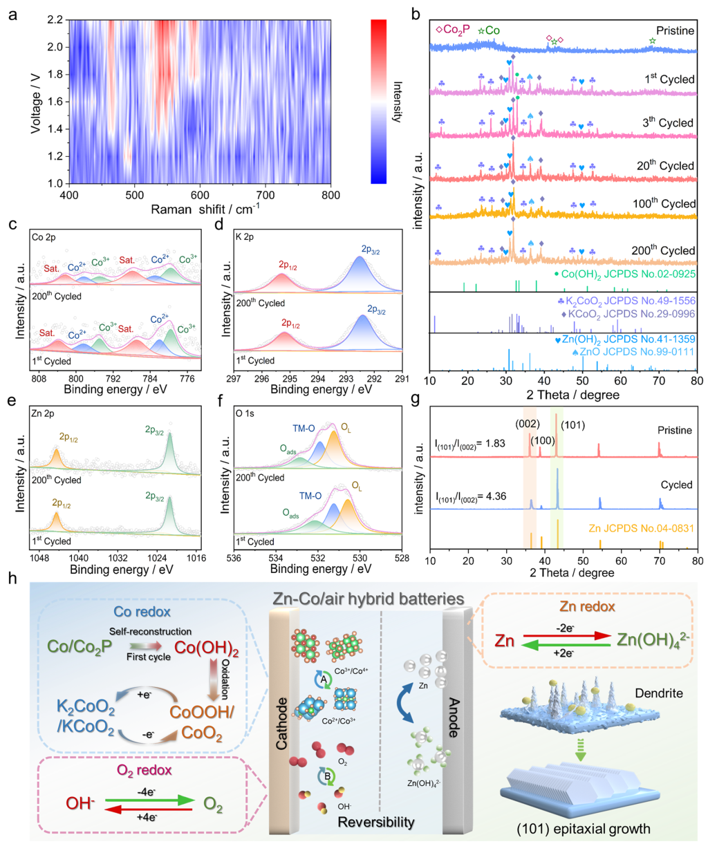 本工作制备了一种类似小麦状的阴极材料(Co/Co2P@PNCF),该材料由P/N共掺杂碳纳米纤维的“中心茎”和密集排列的Co/Co2P异质结构的“谷粒”组成。这种仿生纳米结构不仅提供了大量暴露的活性位点,最大限度地提高了可及性,而且为电子转移和O2/OH-扩散建立了高导电网络。此外,Co/Co2P异质结构在第一个循环过程中自重构产生高价钴活性物种,形成了高效的Co2+↔ Co4+氧化还原对,以提供额外的充放电电压平台。原位拉曼和非原位X射线衍射光谱证明了Co3+/4+Ox(OH)y↔ KxCo2+/3+Oy的可逆过程,提高了电池的效率和耐用性。基于Co/Co2P@PNCF的Zn-Co/air杂化电池具有出色的功率密度(321 mW cm-2)、超长的循环稳定性(700 h)和较高的能量效率(20 mA cm-2时为62%)。这项工作为开发高效稳定的多功能电催化剂以及设计高性能的新能源体系提供了新的思路与途径。