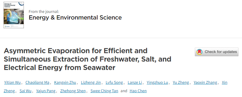 10月28日,威廉英国林业工程学科沈哲红教授研究团队在能源与环境领域国际顶尖期刊《Energy & Environmental Science》(中科院1区Top,IF=32.4)在线发表题为“Asymmetric Evaporation for Efficient and Simultaneous Extraction of Freshwater, Salt, and Electrical Energy from Seawater”(非对称蒸发用于从海水中同时高效提取淡水、盐和电能)的研究论文。第一作者是该团队硕士毕业生吴倚天,通讯作者为williamhill英国青年教师庞亚俊博士和陈浩教授,合作通讯作者为新加坡国立大学Swee Ching Tan教授。William威廉英国为该论文第一单位和通讯作者单位。