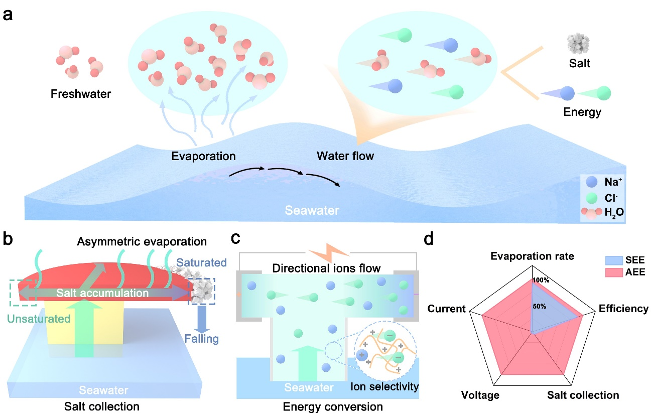 在资源短缺的当下,从储量丰富的海水中提取淡水、盐和电能等基本资源对于人类的生存和发展至关重要。太阳能界面蒸发技术,以其绿色、可持续的特性,仅需太阳光作为唯一能量来源,便能够从海水中提取出宝贵的淡水。然而,海水蒸发淡化过程伴随着盐分的析出,难以清除的盐分会附着在蒸发器的工作区,极大降低工作效率和稳定性。此外,太阳能界面蒸发系统中涉及到各种能量的转换,如何有效捕获海水蒸发过程中产生的能量也是一大挑战。