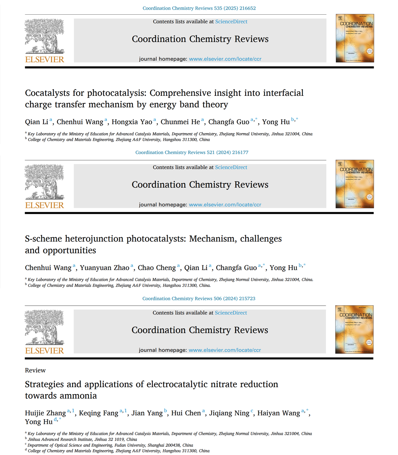 此外,胡勇教授团队基于在光/电催化领域的长期研究积累,近两年在《Coordination Chemistry Reviews》连续发表了多篇综述论文(Coord. Chem. Rev. 2025, 535, 216652;Coord. Chem. Rev. 2024, 521, 21617;Coord. Chem. Rev. 2024, 506, 215723)。该系列综述系统总结了光/电催化材料设计、应用研究与反应机理方面的最新进展,为该领域的发展提供了系统参考与理论支撑,推动了光/电催化从基础研究走向实际应用的进程。