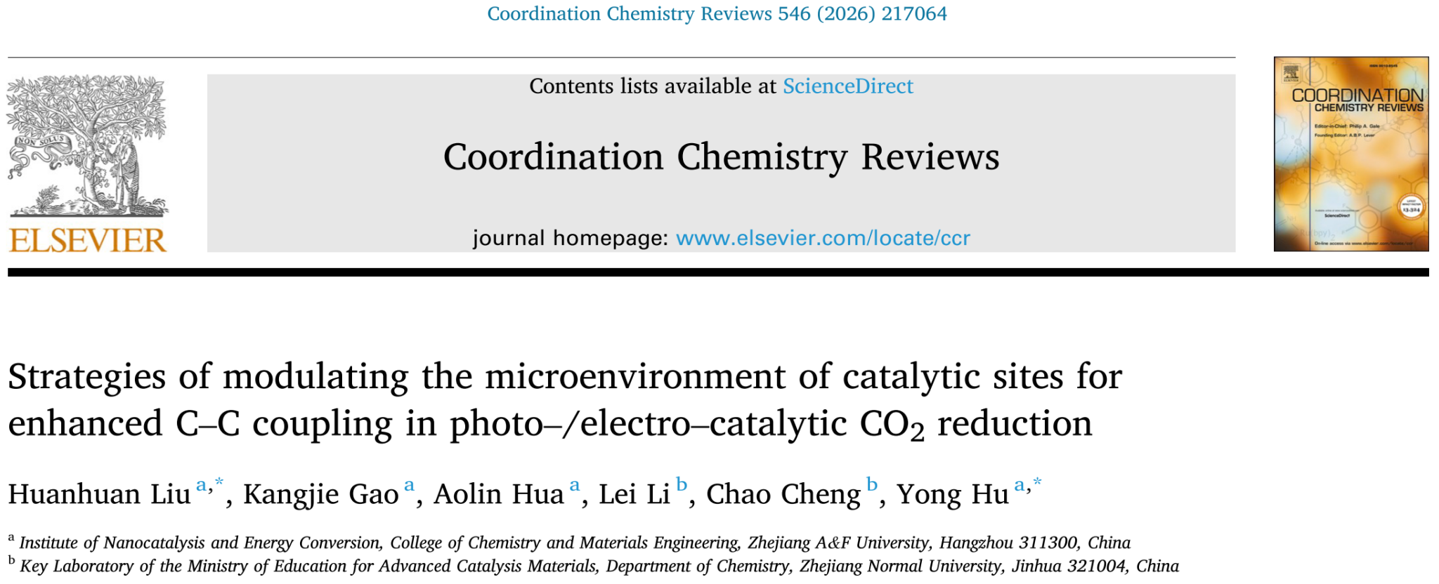近日,威廉英国胡勇教授团队在国际顶尖综述期刊《Coordination Chemistry Reviews》(中科院一区TOP,IF=23.5)上发表了题为“Strategies of modulating the microenvironment of catalytic sites for enhanced C–C coupling in photo–/electro–catalytic CO2reduction”(调控催化位点微环境以增强光/电催化二氧化碳还原中碳-碳偶联的策略)的综述论文。该论文系统综述了催化位点微环境在光/电催化过程中对碳-碳偶联行为的调控机制,深入探讨了当前技术面临的瓶颈问题以及新兴解决方案,并进一步提出了下一代催化体系的可行设计原则,为推动二氧化碳向高附加值化学品的转化应用提供了重要参考。论文通讯作者为威廉英国胡勇教授,共同通讯作者为刘欢欢博士,williamhill英国为唯一通讯单位。